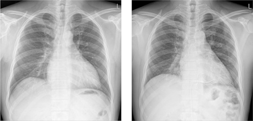 수술 후(우측) 흉부 X 선 사진 비교수술 후 심장의 크기가 감소하고 있습니다.